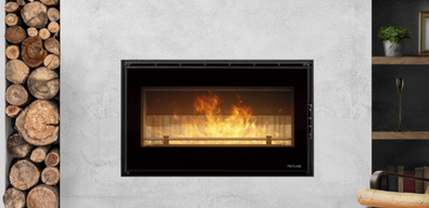 Sistema que integra a função de lareira com caldeira, utilizando pellets para aquecer a água e distribuir calor para diversos ambientes da casa.